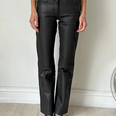 Læder/skind-bukser med indsyet knæbeskyttere. Livvidde 73 cm. Bukselængde 106 cm. Benlængde 80 cm. Str. 29/xs