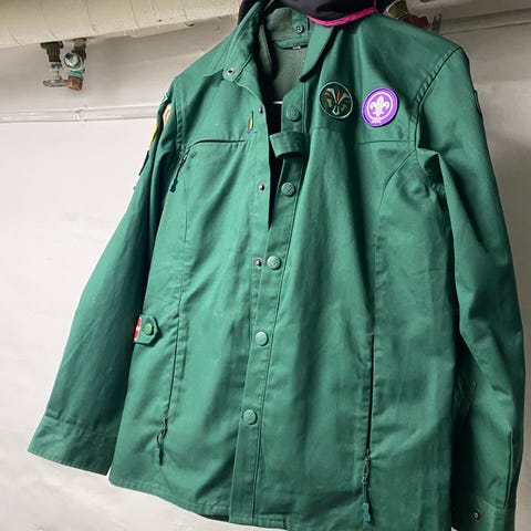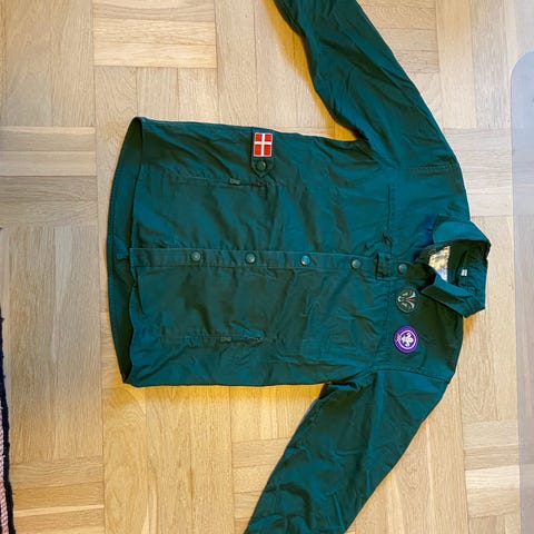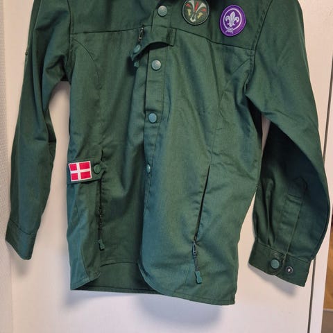 Grøn spejder uniformsskjorte i børnestørrelse 140. Skjorten har knaplukning foran og flere lommer på brystet. Der sidder spejdermærker på brystet. Egnet som spejderuniform til barn med højde omkring 140 cm.