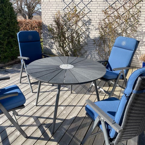 Rundt havesæt med bord og tilhørende stole i sort.