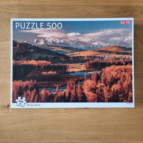 Falcon Carlton puslespil med 1500 brikker. Motivet viser et landskab med sø, blomstereng og bjerge i baggrunden. Egnet som underholdning for unge og voksne, der kan lide større puslespil med naturmotiv.
