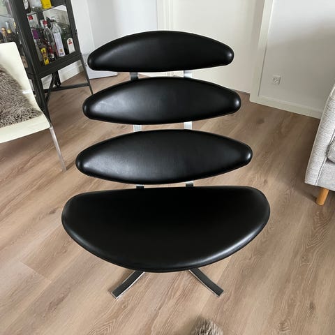Elegant og ikonisk Corona stol udført i sort Omni 301 semianilinlæder med stel i matforkromet fjederstål. Oprindelig nypris: kr. 42.840.