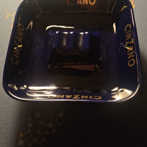 Martell askebæger i blå keramik. Kvadratisk form med rundede hjørner og nedsænket midte. Askebægeret har Martell-logo i bunden og teksten "Martell Cognac" på kanten. Velegnet som askebæger eller som dekorativ genstand, for eksempel i barområde eller samling af barudstyr.