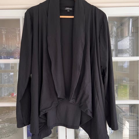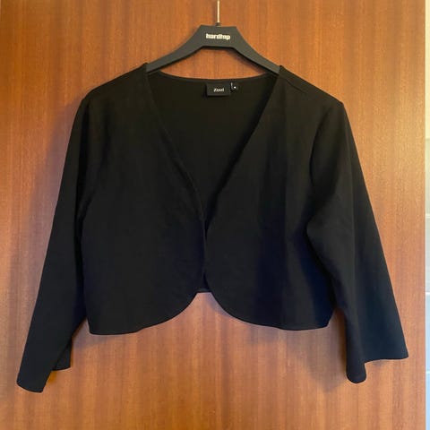Sort jakke/ blazer fra Zizzi i str M 46/48. Den er længere foran, med spidser ned, stor sjalskrave og ærmer som kan smøges op. Rigtig fin og kun brugt en gang.
