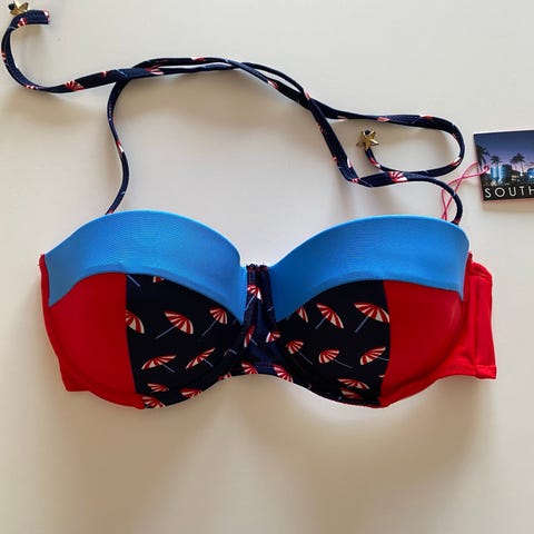 bikiniunderdel til kvinder i størrelse 44. Modellen er i blå polyester med bindebånd i siderne. Indersiden har kontrastfor og et mønster med små ankre på fronten. Velegnet som underdel til badetøj og kan kombineres med forskellige overdele i lignende farver.
