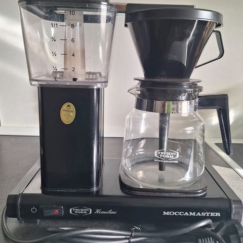 Moccamaster Homeline kaffemaskine med glaskande og vandtank på 1,25 liter. Maskinen er i sort plast med gennemsigtig vandbeholder med måleskala og glaskande med sort håndtag og låg. På typeskiltet fremgår type 741.73B, model H, 230 V, 50 Hz og 1520 W. Kaffemaskinen er egnet til brygning af filterkaffe i husholdningen og placeres fritstående på køkkenbordet. Designet er klassisk med varmeplade under glaskanden og bryggeenhed med filtertragt over kanden.
