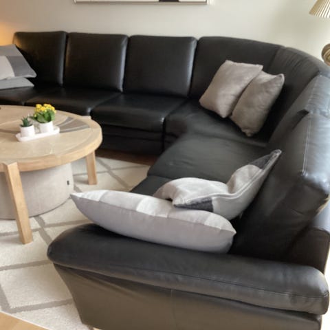 Sofaen fremstår som ny og er kun brugt meget lidt. Alle hynder har samme elasticitet som nye. Sofaen er i ægte læder med hynder i koldskum og ben i sæbebehandlet eg.