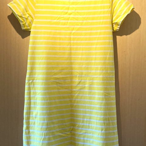 Kjolen er ærmeløs med rund halsudskæring. Den er i en guldfarvet tone med horisontale striber. Indersiden har foer i bomuld. Der er minimal pilling på kjolen, som kun ses meget tæt på. Ellers er den uden brugsspor.