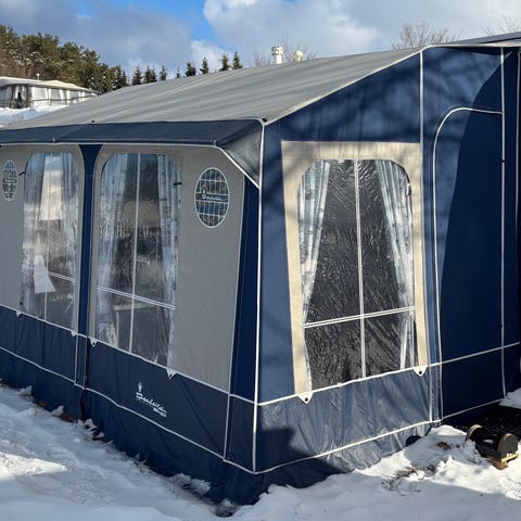 Isabella magnum 320x230 cm fortelt til campingvogn i blå og beige farver. Forteltet har store vinduespartier foran og i siderne, som giver godt lysindfald i opholdsrummet. Det er udstyret med faste sider og front med døråbning, samt klare plastvinduer Forteltet er velegnet som ekstra opholdsrum eller opbevaringsplads ved campingvognen og kan bruges til både kortere og længere ophold på campingpladsen. Str 320-225cm