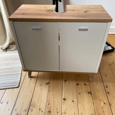 Skuffemodul til badeværelsesskab med 2 skuffer i mørk trælook. Øverste skuffe har indvendig opdeling og udskæring, som giver plads til fx afløbsrør. Skufferne har metalgreb på fronten og lyse indvendige sider i træ. Egnet som underskab under vask eller som opbevaringsmodul i badeværelse eller bryggers. Mindre brugsspor på fronten kan forekomme, jf. billeder. 64x62 x49 cm