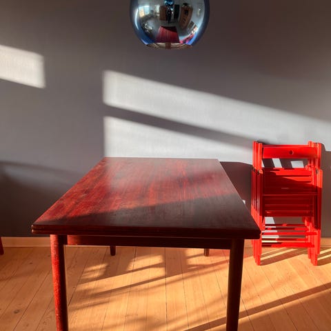 Spisebord i teak med hollandsk udtræk. Nyslebet og -olieret. Egnet som spisebord eller arbejdsbord. Har enkelte ridser og brugsspor i bordpladen og en flænge i fineren på undersiden. Ellers fremstår bordet flot og i god stand. Sælges grundet flytning.