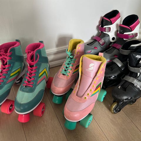 Story rulleskøjter i klassisk side-by-side model. Størrelse 37-38 til børn. Rulleskøjterne er lilla med lyserøde snørebånd og lyse hjul. Høj skaft for støtte om anklen og snørelukning foran. Egnede til rulleskøjteløb på jævne underlag som fx asfalt eller fliser.