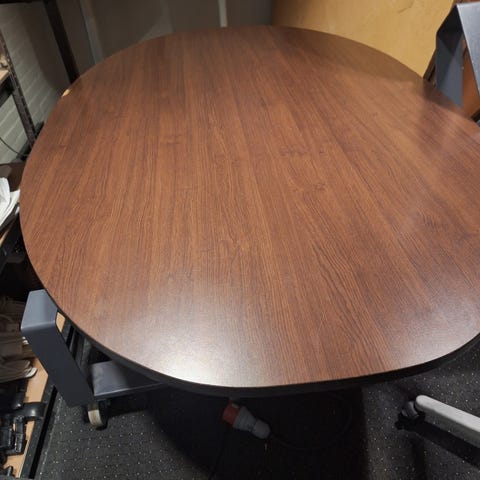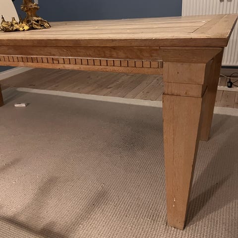 Spisebord med tillægsplade. Bordet har en del synlige skjolder.