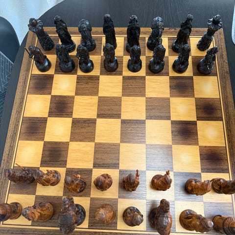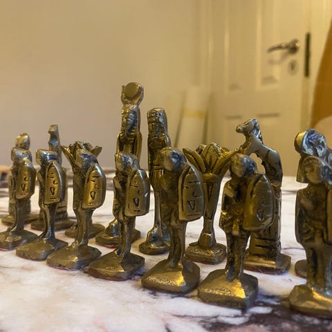 Manopoulos skaksæt med metalbræt og metalskakbrikker. Brættet har et marmoreret design med felter i metalfinish. Brikkerne er udført i metal med figurer inspireret af antikken og leveres samlet i en foret æske med plads til opbevaring af både bræt og brikker. Velegnet til skakspil og som dekorativt sæt i hjemmet.