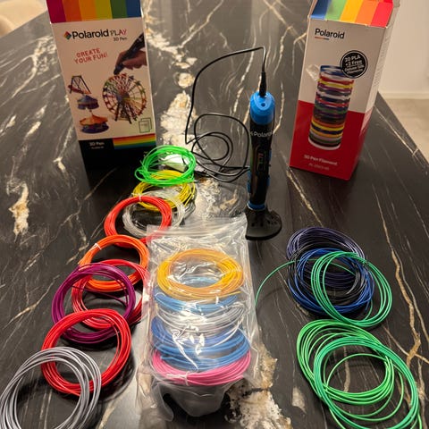3Doodler Create 3D‑pen med tilbehør. Sættet omfatter 3D‑pennen med strømadapter og kabel, samt flere pakker plaststave i forskellige farver til 3D‑tegning. Egnet til kreativt hobbybrug, modellering og mindre gør‑det‑selv‑projekter for større børn og voksne, afhængigt af producentens aldersanbefaling på emballagen.