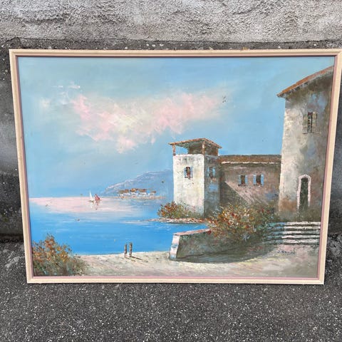 Maleri med maritimt motiv, der forestiller hav og bølger ved strandkant ved solnedgang. Billedet er udført på lærred og indrammet i en klassisk, profileret ramme i gylden farve. Bagsiden viser træramme med ophængswire monteret, klar til ophængning. Signatur kan anes i det nederste område af motivet. Størrelse m/u ramme: 47/68*69/80*3,5 cm