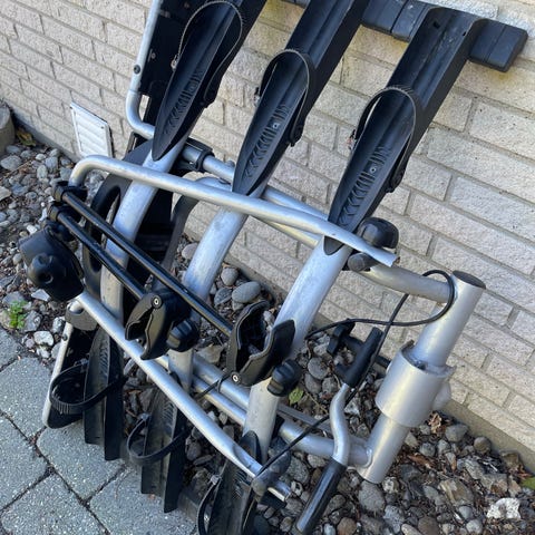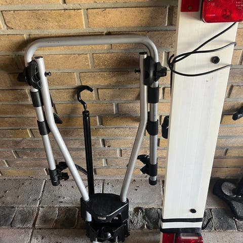Thule cykelholder til anhængertræk i sort/sølv. Cykelholderen monteres på bilens anhængertræk og har skinner til montering af cykler samt integrerede baglygter og plads til nummerplade. Velegnet til transport og opbevaring af cykler på bilrejser. Konstruktion i metal og plast med sammenklappeligt design for lettere håndtering og opbevaring, når den ikke er i brug. Inkl. nøgler