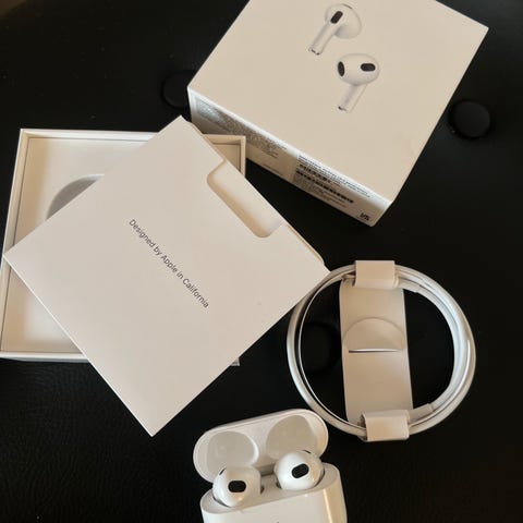 Apple AirPods 3. generation headset i hvid. Trådløse in-ear høretelefoner med opladningsetui. Leveres med hvidt standardetui samt et ekstra beskyttelsescover i blå, som kan ses på billederne. Velegnet til brug med Apple-enheder via Bluetooth-forbindelse.