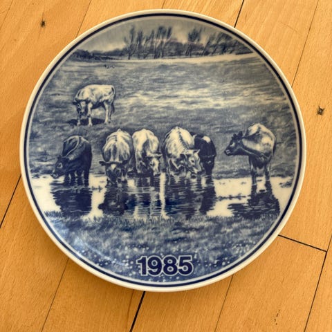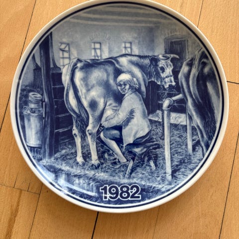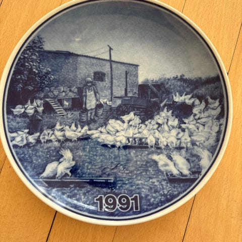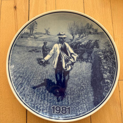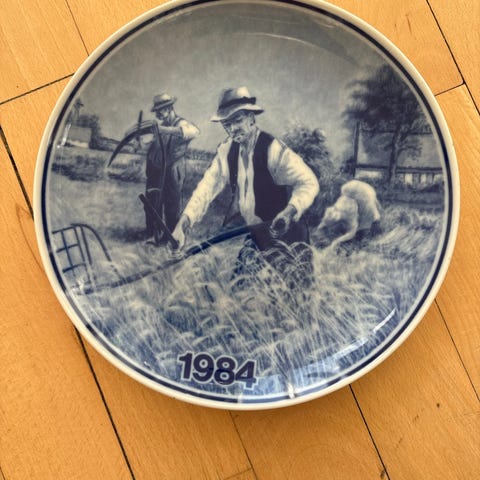 Landbrugsplatte 1986 porcelænsplatte i blå-hvid dekoration. Forsiden viser et landbrugsmotiv med heste og markarbejde samt årstallet 1986. Bagsiden har påskrift med modeloplysninger og ophængsanordning, så pladen kan hænges på væggen. Fremstillet i Danmark i porcelæn med trykt blå dekoration på hvid bund.