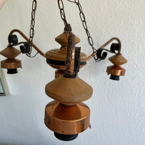 Retro loftpendel i syrebehandlet kobber og gult glas fra 1960'erne.