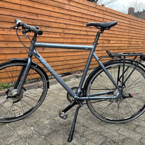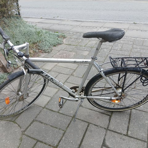 MBK hybridcykel til unisex med stelstørrelse M og 28" (700c) hjul. Cyklen har lige styr og udvendige gear. 21 stk. Den er udstyret med forgaffel med affjedring, V-bremser for og bag samt skærme bagtil. Egnet til både bykørsel og længere ture på asfalt og let grus. Farven fremstår som sølv/grå baseret på billederne.