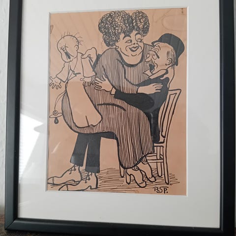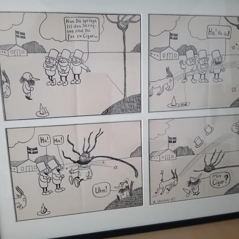 Original Storm P satire tegning, som ser ud til at være lavet til Jyllands Posten eller anden avis.