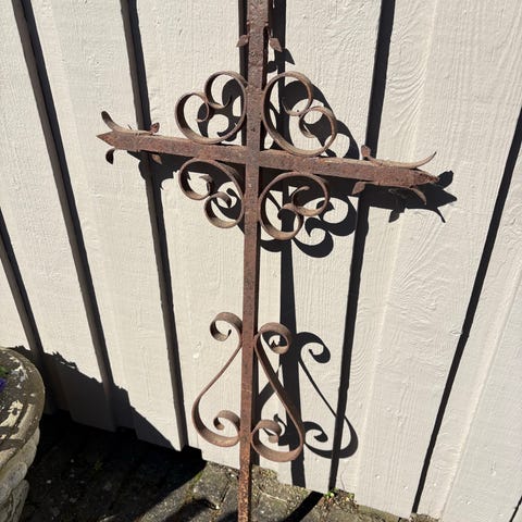 Dekorativt kors i støbejern med detaljeret bladranke og naturinspireret struktur. Korset er egnet som udsmykning i hjemmet, i haven, i et kapel eller i en mindehave. Overfladen fremstår mørkpatineret med tydelige relieffer i form af blade og grene.