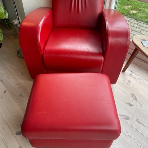 Super fin rød lænestol. Den er gammel, hvilket selvfølgelig kan ses, men synes det stadig er i fin stand