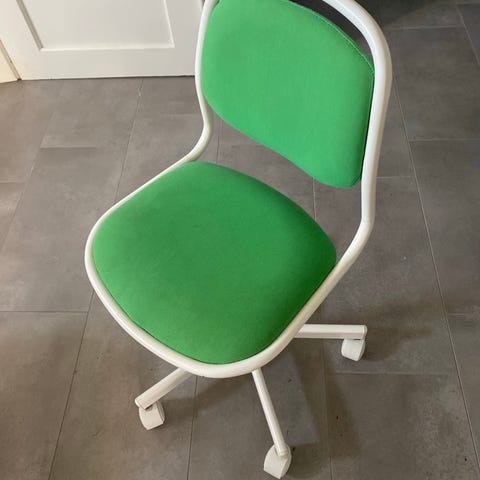 IKEA børnestol i grøn plast. Stolen har hel ryglæn og sæde i formstøbt plast med integrerede ben. Egnet til brug ved børnebord eller som ekstra siddeplads på børneværelset. Overfladen er glat og kan tørres af med en fugtig klud.