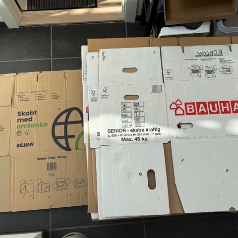 I alt ca 80 flyttekasser. De 45 er Senior flyttekasser fra Bauhaus som kun har været anvendt 1 gang. Nypris 40 kr pr stk og max belastning 45 kg