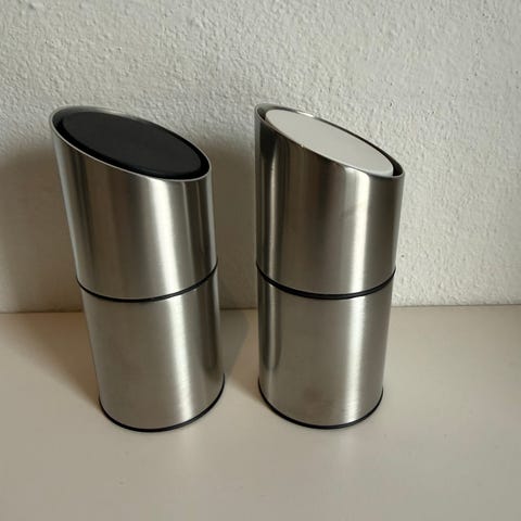 Georg Jensen salt- og peberkværn sæt i rustfrit stål. Sættet består af to kværne med blankpoleret overflade og indbygget kværnmekanisme i bunden. Egnet til brug som bordkværne til salt og peber i køkken eller på spisebord. Designet er kompakt med afrundet top og let buet krop for godt greb. Velegnet til daglig brug i husholdningen.