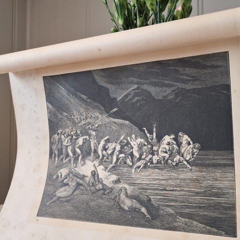 Nøgleord: Dante, Den Guddommelige Komedie, Divine Comedy, Helvede, Inferno, poesi, poet, legendarisk, gravering, ætsning, nøgen, kvinde, bryster, såret, døden, livet, angst, kamp, dyr, okse.