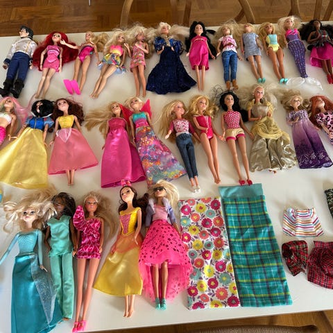 Barbie dukker + tilbehør. Sættet består af flere Barbie-lignende mode- og prinsessedukker i forskellige outfits samt enkelte mandlige dukker. Der medfølger også noget tilbehør, blandt andet en legetøjs-scooter og en plastik-hest. Dukkerne har forskellige hårfarver og tøjstile. Det hele følger med.