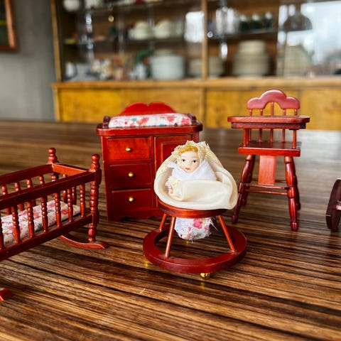 Dukkehus møbelsæt med hvid tremmeseng, seng, kravlegård og lille stol/bord. Møblerne er i miniaturestørrelse til dukkehus og udført i hvidt materiale med sengetøj i mønstrede tekstiler i forskellige blomster- og ternede designs. Sættet kan bruges som indretning i et klassisk dukkehus soveværelse og børneværelse.