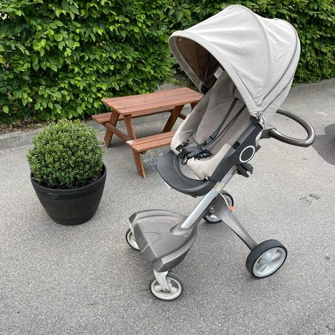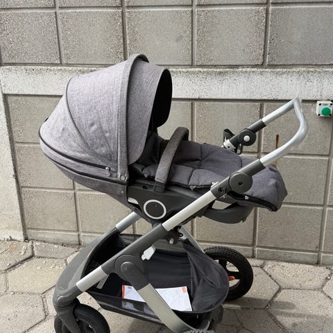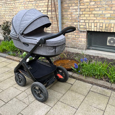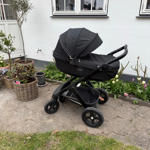 Stokke klapvogn i sort. Vognen har drejelige forhjul og større baghjul, justerbart sæde med kaleche og fodstøtte samt aftagelig frontbøjle. Under sædet er der en opbevaringskurv. Egnet til ét barn og kan bruges til både hverdag og ture ud af huset