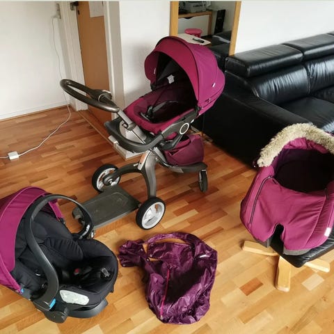 Der medfølger pusletaske , barnevognskasse , kørepose , myggenet og shoppingbag.
