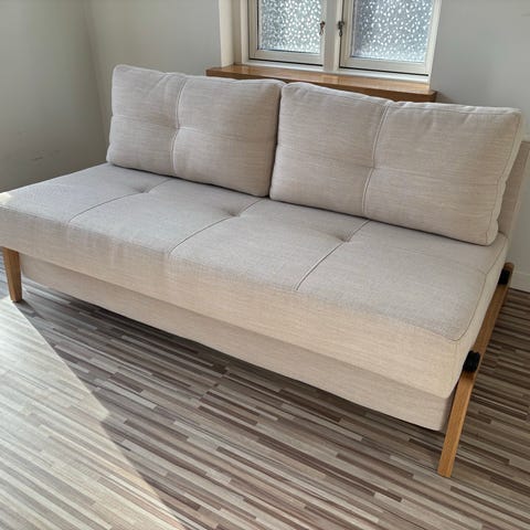 Snedkerlavet lille sofa. Den er købt på dba og er lavet af sælgerens far som var snedker. Jeg har slebet den og havde i sinde at give den olie og sy nyt betræk til puderne, men er ikke blevet færdig med projektet. Puderne mangler kun en lukning og den fungerer også fint uden olie. Byd gerne! Kan hentes på Nørrebro.