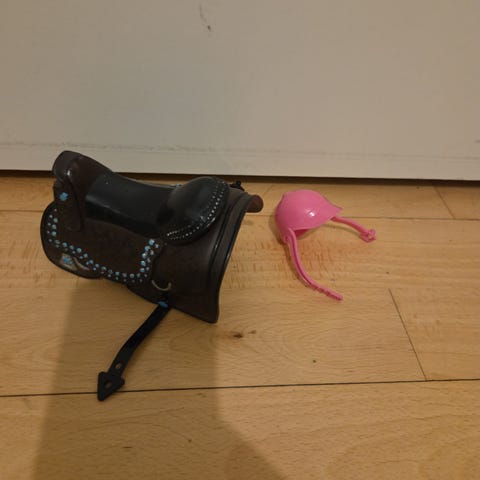 Kæpheste hestetilbehør sæt med flere dele til leg. Sættet omfatter blandt andet grime, hovedtøj, fortøj og træktov.