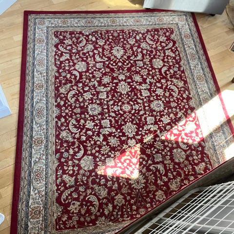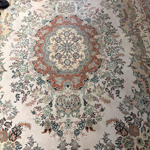 tæppe med orientalsk inspireret mønster i blå og beige nuancer. Rektangulær form med bort hele vejen rundt og frynser i enderne. Egnet som gulvtæppe i stue, soveværelse eller gang. Materiale og præcise mål er ikke oplyst.