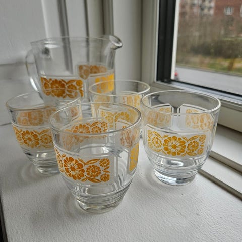 Glas, Glas, 2 x Kander + 5 glas, Superflotte Retro kander og glas. 2 forskellige kander med samme mønster + 5 stk. glas. Kun skår i 1 af glassene. Sendes desværre ikke, men fleksibel afhentningstid.