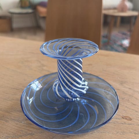 Hay Flare lysestage i blå glas. Dekorativ glaslysestage med spiralformet mønster, velegnet til placering på bord, hylde eller vindueskarm. Designet til almindelige stearinlys og kan bruges enkeltvis eller flere sammen som borddekoration.