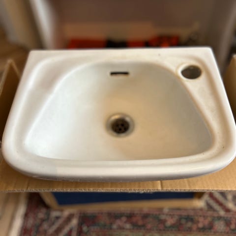 Håndvask (55*40). Der mangler pakning til bundventil (altså gummiringen, så den kan lukke helt tæt, hvis man skal fylde vand i håndvaske.