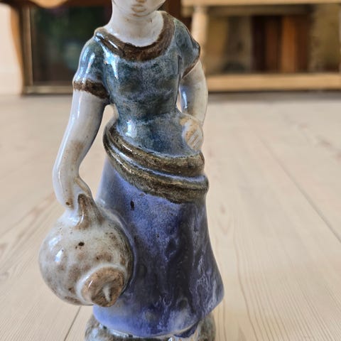 Dekorativ skulptur i sort keramik. Skulpturen forestiller to stiliserede figurer i et organisk, afrundet formsprog. Overfladen er mat og ensfarvet sort. På undersiden ses indgraveret signatur og mærke. Velegnet som indretningsobjekt på hylde, reol eller vindueskarm i stue, soveværelse eller entré.
