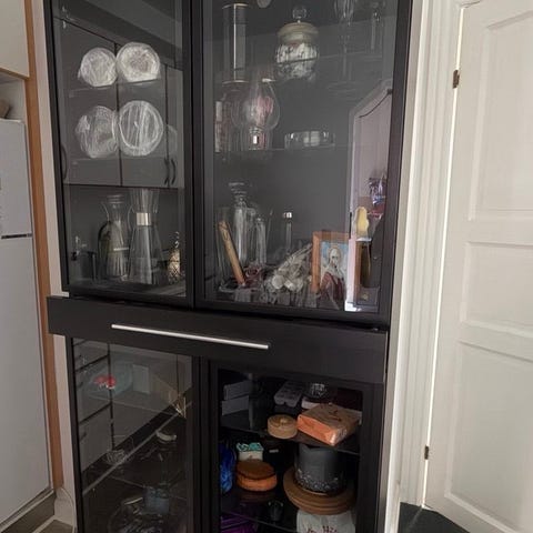 3 flotte vinrøde vitrineskabe, 80 cm brede og 33 høje samt dybe. Matteret glas. Åbner opad, og har gasdæmpere. Originale HTH skabe.