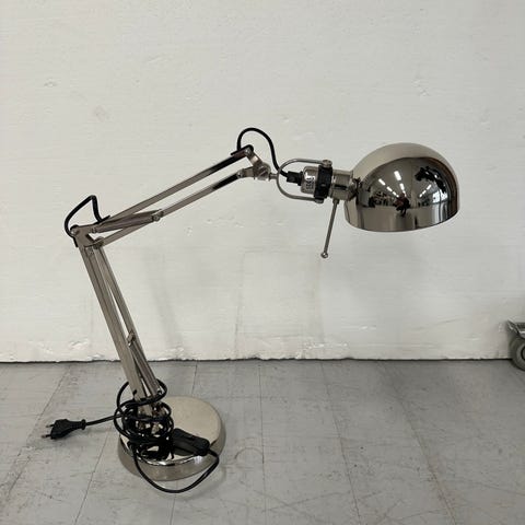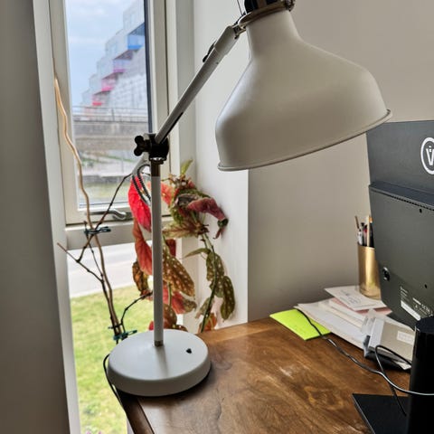 Lampen har rund fod med afbryderknap. Den har ledning og stik samt fatning til standard pære (se mærkat i skærmen for maksimal watt). Velegnet som skrivebordslampe eller læselampe på bord eller kommode.