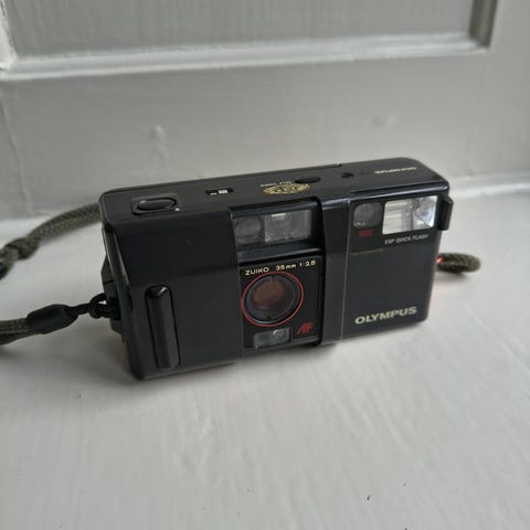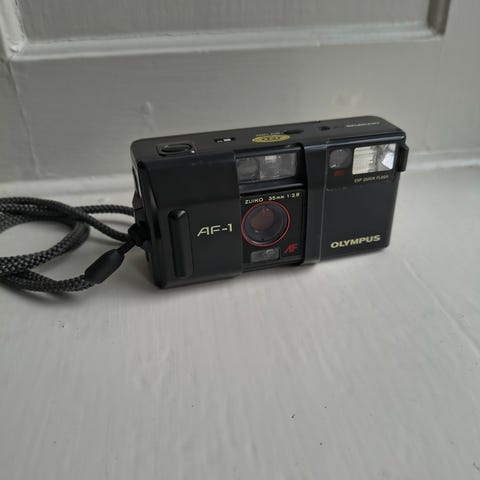Olympus AF-1 / AF1 – kompakt 35mm autofokus-kamera fra 1980’erne i flot stand. Skarpt Zuiko 35mm f/2.8 objektiv. Fuldautomatisk eksponering, indbygget blitz og motoriseret filmfremføring. Ingen svamp eller fungus på optikken, som ellers er et kendt problem. Lille og let – perfekt til lomme og hverdagsbrug. Ideel til dig, der vil i gang med filmfotografering, eller den erfarne, der søger et fedt point-and-shoot. Testet og alt virker.