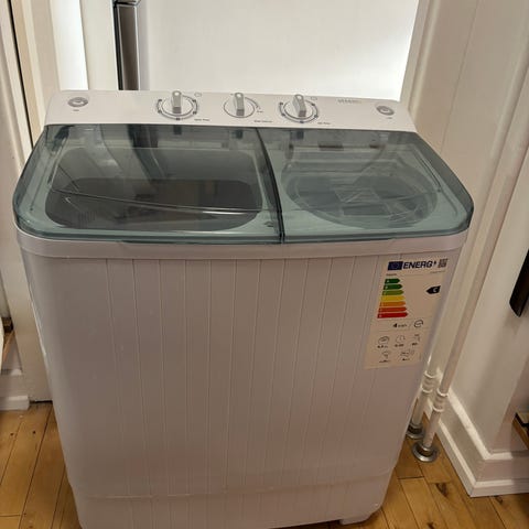 Kompakt Ulsoni-vaskemaskine, som er perfekt til campingturen eller i kolonihavehuset. Man behøver ikke vandrør, da man bare fylder vand direkte i den. Den kan slynge tøjet i mindre bidder, efter det er blevet vasket.