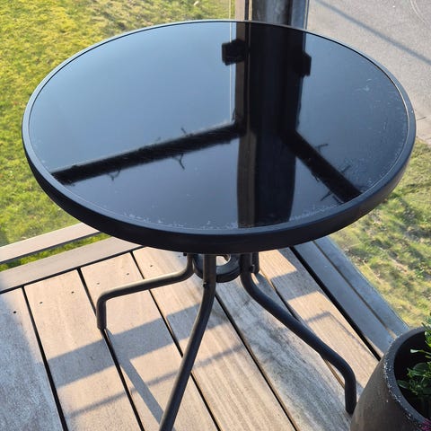 Havebord med rektangulær glasplade 200x100cm og seks tilhørende havestole. Bordet har sort glasplade og stel i lyst alu. Stolene har alustel med sort mesh-sæde og -ryg. Stoleryggen kan justeres (ligges ned).