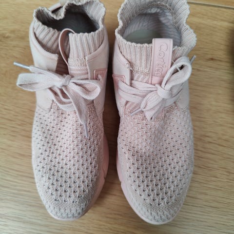 Hvid, strikket sneaker i et sock-style design med snørelukning og en åndbar mesh-overdel, sko kendetegnes ved at være lette og fleksible, med en komfortabel gummisål.