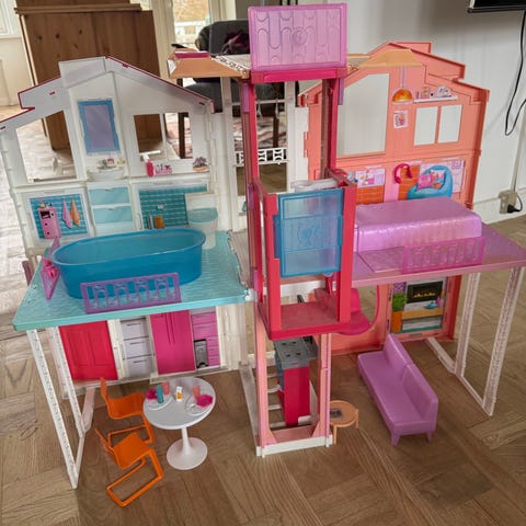 Barbie dukkehus med flere etager. Huset har indbygget elevator i tårnet samt forskellige rum med seng, balkon og indretningsdetaljer. Der medfølger tilbehør som sofa, borde og stole.