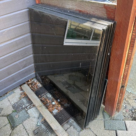Glasplader egnet til brug i byggeri eller renoveringsprojekter. Pladerne er stablet på palle og fremstår som plane glasfelter, der kan anvendes eksempelvis til vinduer, skillevægge eller andre konstruktioner, hvor der ønskes glasflader. Sælges samlet som vist på billederne. De er mørk tonet og måler 82x92,5 cm. Thermoglas.
